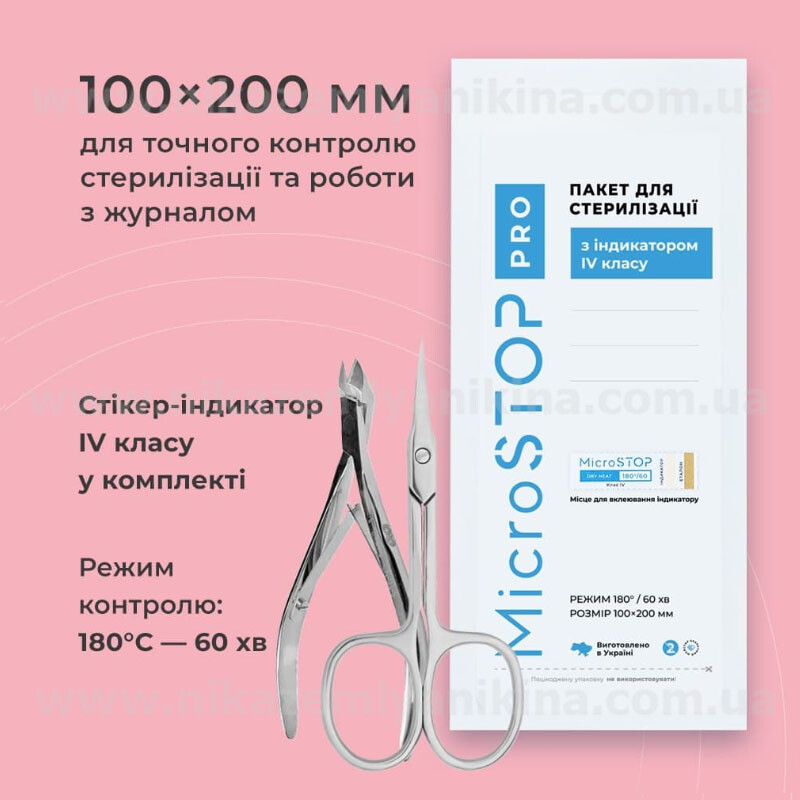 Крафт-пакети MicroSTOP для стерилізації робочого інструменту для парової, повітряної стерилізації.  Виготовлені з крафт-паперу, легко проникні для відповідних стерилізуючих агентів, у закритому вигляді непроникні для мікроорганізмів, зберігають цілісність після стерилізації відповідним методом. На пакеті нанесений індикатор (після проведення процедури змінюється колір), що дуже зручно визначення ефективності стерилізації.
